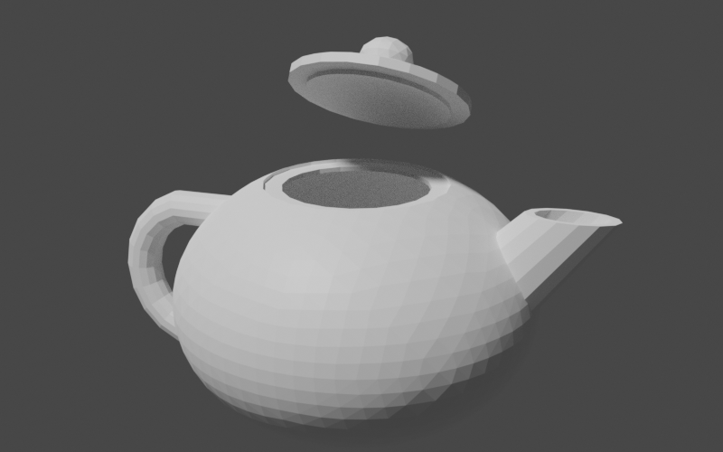 }Loading this into our 3D modeling program gives us two separate geometries that we can manipulate independently. The image below shows the teapot with the lid lifted up to reveal the interior.