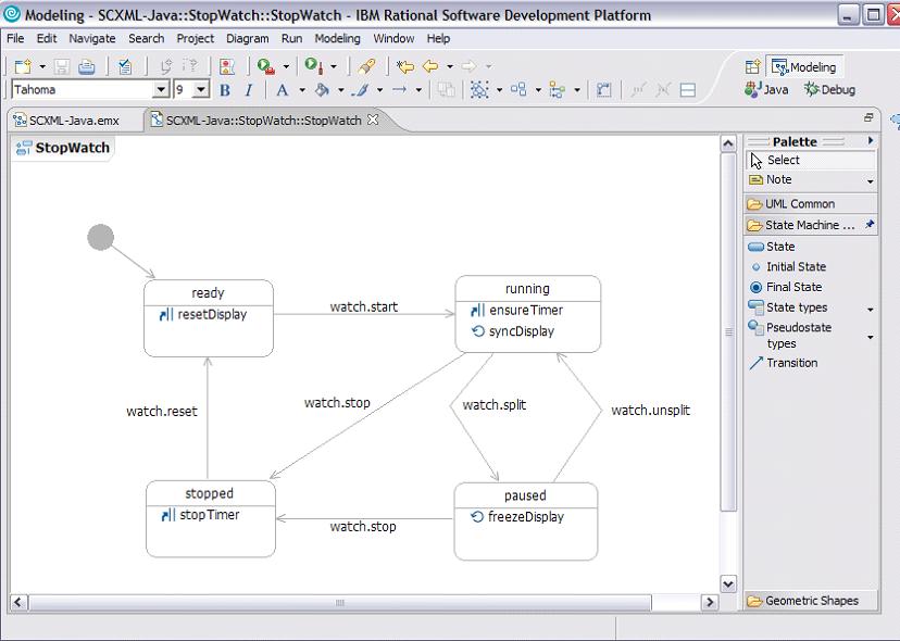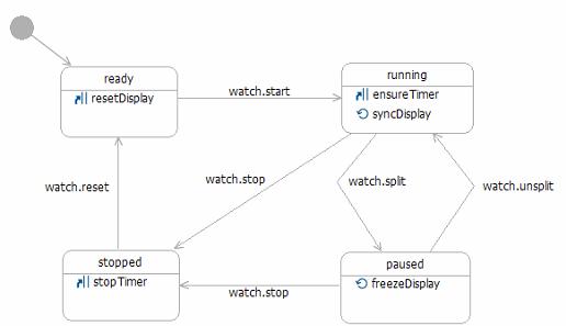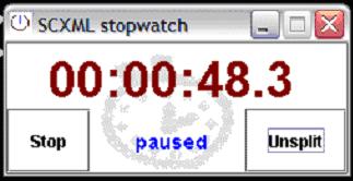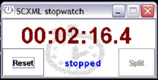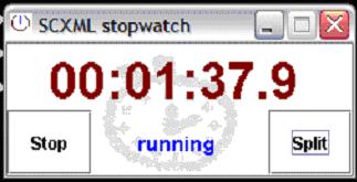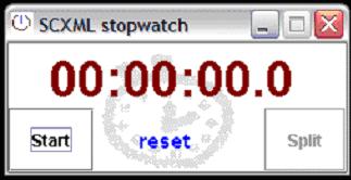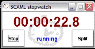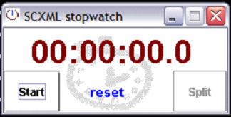of this particular stopwatch: The SCXML documentThe SCXML document is then, a simple serialization of the "model" above: stopwatch.xml. The Stopwatch classHere is the class that implements the stopwatch behavior, StopWatch.java. The class extends AbstractStateMachine.java, which provides one approach for providing the base functionality needed by classes representing stateful entities. Points to note in the StopWatch class are: